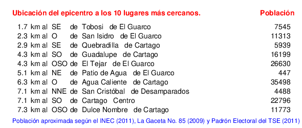 Mapa de la zona epicentral. Se muestran las poblaciones más cercanas al epicentro y fallas activas. Abajo están las distancias que hay del epicentro a cada uno de los diez sitios más cercanos y la cantidad de habitantes que poseen.