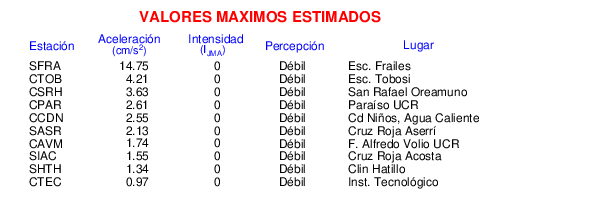 Intensidades en sitios de registro.Cada uno de los cuadrados en el mapa corresponde a la ubicación de un acelerógrafo al momento del sismo. Estos se muestran en distintos colores según la escala mostrada al pie de la figura.
