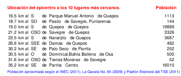 Detalle de la zona epicentral:. Se muestran los poblados más cercanos al epicentro en un radio de unos 30 km. Las principales fallas activas son las trazas de color rojo. Abajo están las distancias que hay del epicentro a cada uno de los diez sitios más cercanos y la cantidad de habitantes que poseen.