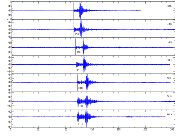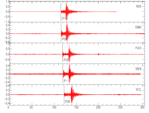 Mapa del epicentro: Los triángulos verdes son las estaciones acelerográficas usadas para calcular el epicentro que se muestra como un punto amarillo. El detalle de la magnitud y distancia a San José se muestra en el cuadro inserto en el mapa.