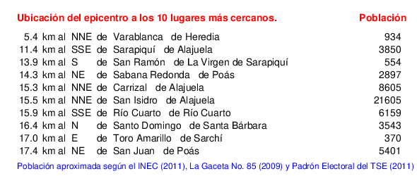 Mapa de la zona epicentral. Se muestran las poblaciones más cercanas al epicentro y fallas activas. Abajo están las distancias que hay del epicentro a cada uno de los diez sitios más cercanos y la cantidad de habitantes que poseen.