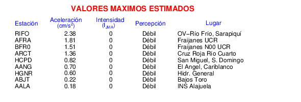 Intensidades en sitios de registro.Cada uno de los cuadrados en el mapa corresponde a la ubicación de un acelerógrafo al momento del sismo. Estos se muestran en distintos colores según la escala mostrada al pie de la figura.