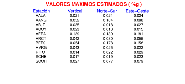 La siguiente tabla muestra los datos de aceleración máxima para cada componente en porcentaje de la aceleración de la gravedad (%g). Estos se obtienen dividiendo el valor del PGA registrado por 980 cm/s2 y multiplicándolo por 100.
