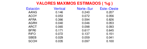 La siguiente tabla muestra los datos de aceleración máxima para cada componente en porcentaje de la aceleración de la gravedad (%g). Estos se obtienen dividiendo el valor del PGA registrado por 980 cm/s2 y multiplicándolo por 100.