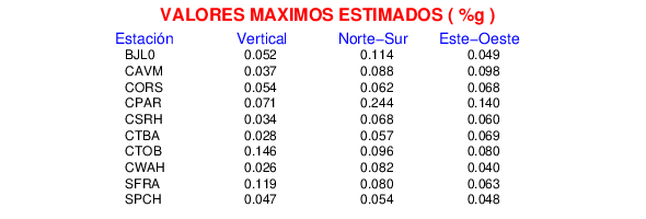 La siguiente tabla muestra los datos de aceleración máxima para cada componente en porcentaje de la aceleración de la gravedad (%g). Estos se obtienen dividiendo el valor del PGA registrado por 980 cm/s2 y multiplicándolo por 100.
