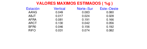La siguiente tabla muestra los datos de aceleración máxima para cada componente en porcentaje de la aceleración de la gravedad (%g). Estos se obtienen dividiendo el valor del PGA registrado por 980 cm/s2 y multiplicándolo por 100.