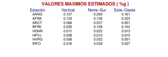 La siguiente tabla muestra los datos de aceleración máxima para cada componente en porcentaje de la aceleración de la gravedad (%g). Estos se obtienen dividiendo el valor del PGA registrado por 980 cm/s2 y multiplicándolo por 100.