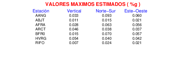 La siguiente tabla muestra los datos de aceleración máxima para cada componente en porcentaje de la aceleración de la gravedad (%g). Estos se obtienen dividiendo el valor del PGA registrado por 980 cm/s2 y multiplicándolo por 100.