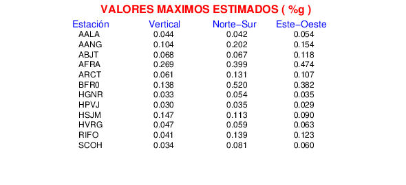 La siguiente tabla muestra los datos de aceleración máxima para cada componente en porcentaje de la aceleración de la gravedad (%g). Estos se obtienen dividiendo el valor del PGA registrado por 980 cm/s2 y multiplicándolo por 100.