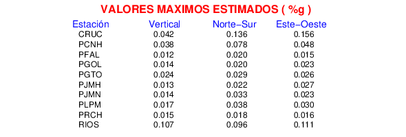 La siguiente tabla muestra los datos de aceleración máxima para cada componente en porcentaje de la aceleración de la gravedad (%g). Estos se obtienen dividiendo el valor del PGA registrado por 980 cm/s2 y multiplicándolo por 100.