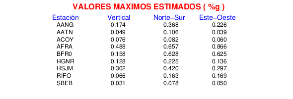 La siguiente tabla muestra los datos de aceleración máxima para cada componente en porcentaje de la aceleración de la gravedad (%g). Estos se obtienen dividiendo el valor del PGA registrado por 980 cm/s2 y multiplicándolo por 100.