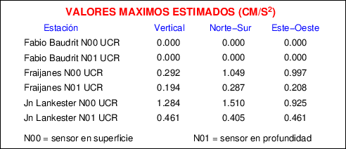 Aquí se muestran las formas de onda y cocientes espectrales de los sensores colocados en pozo . Uno se ubica en el Jardín Lankester en Paraíso de Cartago con 30 m de profundidad y el otro en la Estación Experimental Fabio Baudrit en Alajuela con 40 m de profundidad. La tabla muestra los valores de aceleración máxima (PGA) leídos de las tres componentes en superficie (N00) y en profundidad (N01)