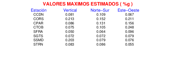 La siguiente tabla muestra los datos de aceleración máxima para cada componente en porcentaje de la aceleración de la gravedad (%g). Estos se obtienen dividiendo el valor del PGA registrado por 980 cm/s2 y multiplicándolo por 100.