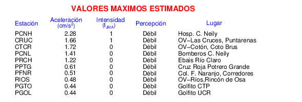 Intensidades en sitios de registro.Cada uno de los cuadrados en el mapa corresponde a la ubicación de un acelerógrafo al momento del sismo. Estos se muestran en distintos colores según la escala mostrada al pie de la figura.