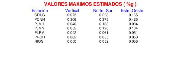 La siguiente tabla muestra los datos de aceleración máxima para cada componente en porcentaje de la aceleración de la gravedad (%g). Estos se obtienen dividiendo el valor del PGA registrado por 980 cm/s2 y multiplicándolo por 100.