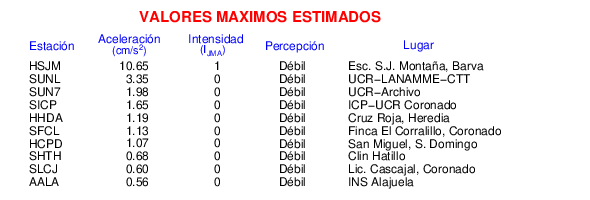 Intensidades en sitios de registro.Cada uno de los cuadrados en el mapa corresponde a la ubicación de un acelerógrafo al momento del sismo. Estos se muestran en distintos colores según la escala mostrada al pie de la figura.