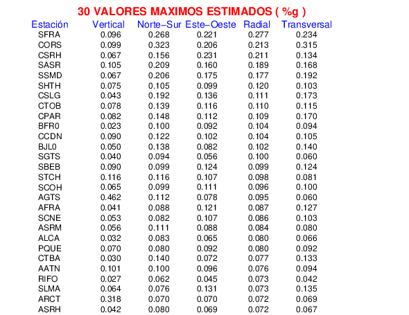 La siguiente tabla muestra los datos de aceleración máxima para cada componente en porcentaje de la aceleración de la gravedad (%g). Estos se obtienen dividiendo el valor del PGA registrado por 980 cm/s2 y multiplicándolo por 100. Los valores de las últimas dos columnas corresponden a la componente radial y transversal. Los datos se listan en orden descendente según el valor de la componente radial.