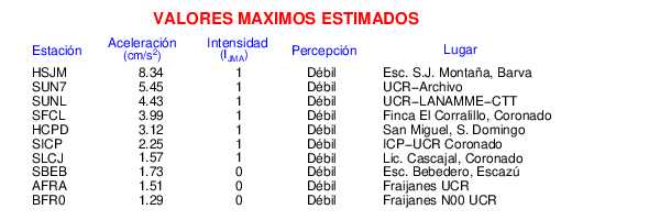 Intensidades en sitios de registro.Cada uno de los cuadrados en el mapa corresponde a la ubicación de un acelerógrafo al momento del sismo. Estos se muestran en distintos colores según la escala mostrada al pie de la figura.