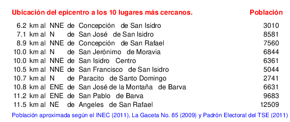 Mapa de la zona epicentral. Se muestran las poblaciones más cercanas al epicentro y fallas activas. Abajo están las distancias que hay del epicentro a cada uno de los diez sitios más cercanos y la cantidad de habitantes que poseen.
