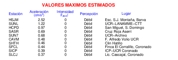 Intensidades en sitios de registro.Cada uno de los cuadrados en el mapa corresponde a la ubicación de un acelerógrafo al momento del sismo. Estos se muestran en distintos colores según la escala mostrada al pie de la figura.