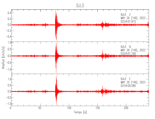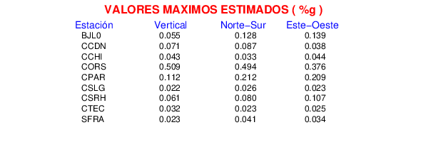 La siguiente tabla muestra los datos de aceleración máxima para cada componente en porcentaje de la aceleración de la gravedad (%g). Estos se obtienen dividiendo el valor del PGA registrado por 980 cm/s2 y multiplicándolo por 100.