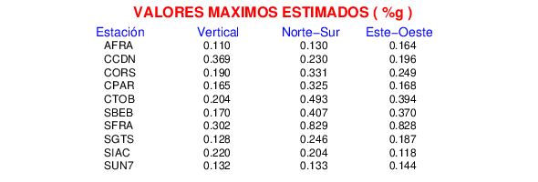La siguiente tabla muestra los datos de aceleración máxima para cada componente en porcentaje de la aceleración de la gravedad (%g). Estos se obtienen dividiendo el valor del PGA registrado por 980 cm/s2 y multiplicándolo por 100.