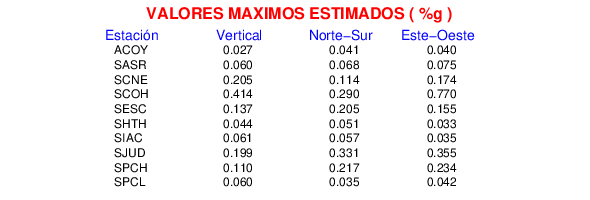La siguiente tabla muestra los datos de aceleración máxima para cada componente en porcentaje de la aceleración de la gravedad (%g). Estos se obtienen dividiendo el valor del PGA registrado por 980 cm/s2 y multiplicándolo por 100.