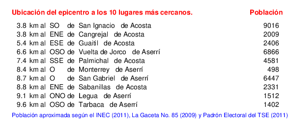 Mapa de la zona epicentral. Se muestran las poblaciones más cercanas al epicentro y fallas activas. Abajo están las distancias que hay del epicentro a cada uno de los diez sitios más cercanos y la cantidad de habitantes que poseen.