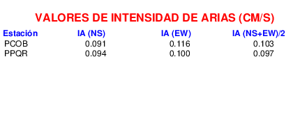 En esta sección se muestra el cáculo de la IA para la componente norte-sur (NS) y este-oeste (EW) de los registros de aceleración que tuvieron valores superiores a los 5 cm/s2, así como el valor total de esta que corresponde al promedio de ambas componentes horizontales.