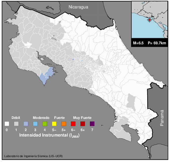 Este mapa muestra la división política de Costa Rica a nivel de distritos. Según nuestros cálculos, la intensidad de grado 2 o superior en la escala de JMA (que varía de 0 a 7) afectó un total de 5 distritos. La lista de estos se muestra bajo del mapa en orden alfabético.