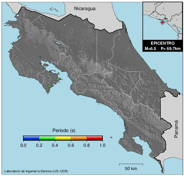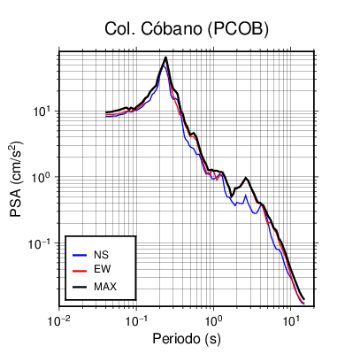 En los siguientes gráficos, la traza verde es el espectro propuesto por el CSCR-2010, la traza negra es el espectro máximo de este sismo. El valor de la amplitud está dado en pseudoaceleración en cm/s2.