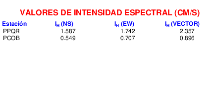 En esta sección se muestra el cáculo de la intensidad de Housner, IH para la componente norte-sur (NS) y este-oeste (EW) y la suma vectorial de los registros de aceleración que tuvieron valores superiores a los 5 cm/s2.