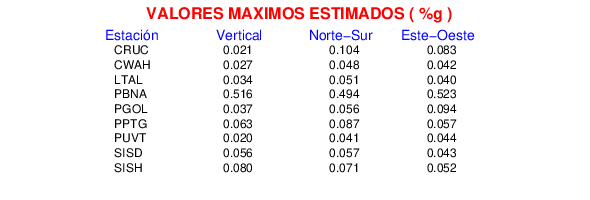 La siguiente tabla muestra los datos de aceleración máxima para cada componente en porcentaje de la aceleración de la gravedad (%g). Estos se obtienen dividiendo el valor del PGA registrado por 980 cm/s2 y multiplicándolo por 100.