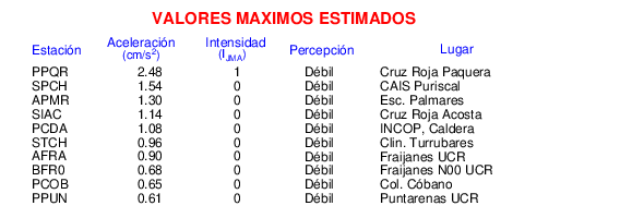 Intensidades en sitios de registro.Cada uno de los cuadrados en el mapa corresponde a la ubicación de un acelerógrafo al momento del sismo. Estos se muestran en distintos colores según la escala mostrada al pie de la figura.