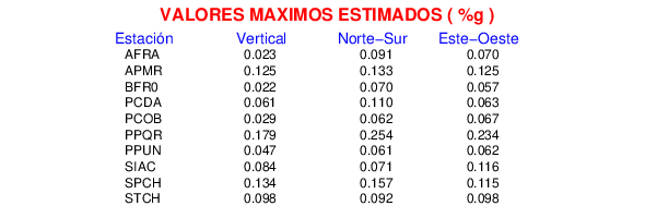 La siguiente tabla muestra los datos de aceleración máxima para cada componente en porcentaje de la aceleración de la gravedad (%g). Estos se obtienen dividiendo el valor del PGA registrado por 980 cm/s2 y multiplicándolo por 100.