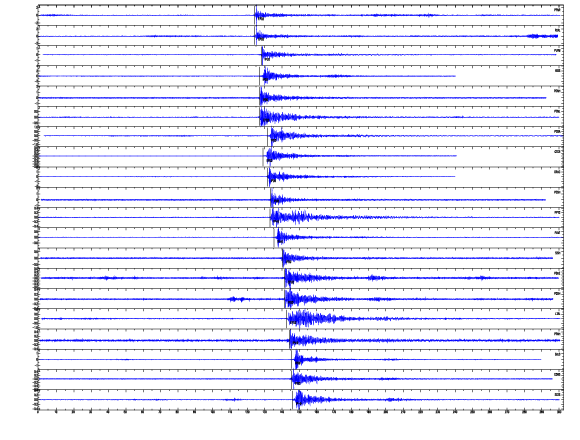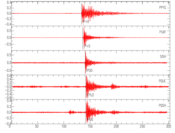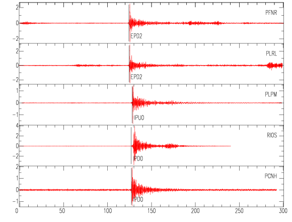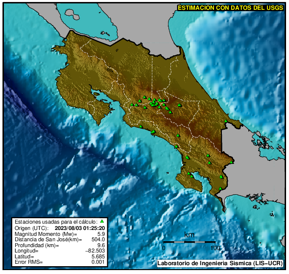Mapa del epicentro: Los triángulos verdes son las estaciones acelerográficas usadas para calcular el epicentro que se muestra como un punto amarillo. El detalle de la magnitud y distancia a San José se muestra en el cuadro inserto en el mapa.