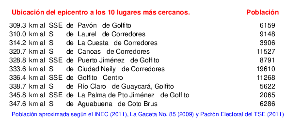 Detalle de la zona epicentral:. Se muestran los poblados más cercanos al epicentro en un radio de unos 30 km. Las principales fallas activas son las trazas de color rojo. Abajo están las distancias que hay del epicentro a cada uno de los diez sitios más cercanos y la cantidad de habitantes que poseen.