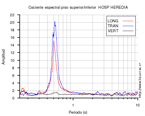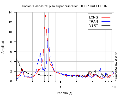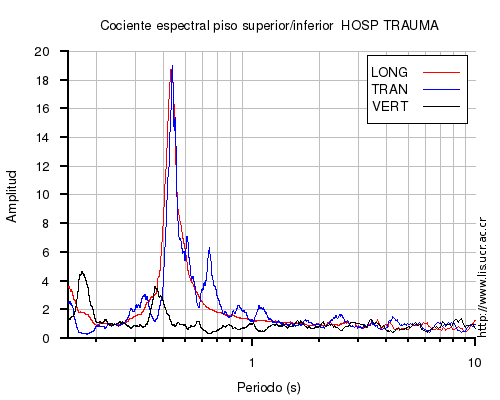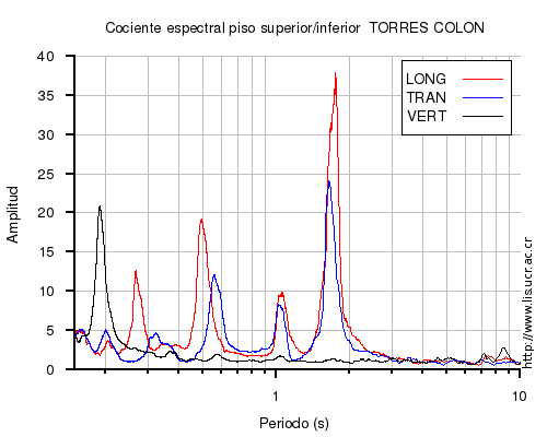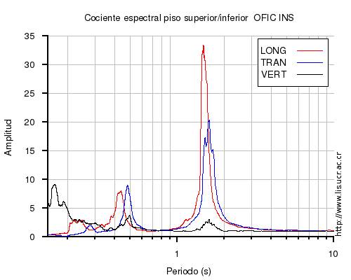 También se muestra el cociente espectral (en el rango de 0.1 a 10 s) entre el nivel superior (sea el último piso o la azotea) e inferior (sea el primero piso o el sótano) para cada una de las componentes LONG=longitudinal, TRAN=transversal y VERT=vertical. En los casos en que el nivel superior o inferior no estén disponibles al momento del sismo, se muestra una imagen con la leyenda "No se pudo calcular".