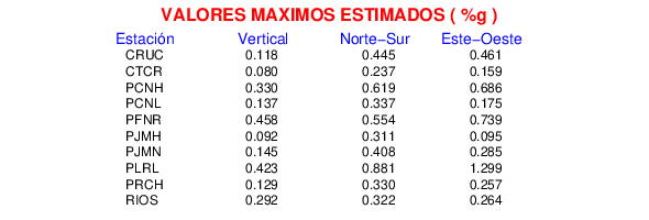 La siguiente tabla muestra los datos de aceleración máxima para cada componente en porcentaje de la aceleración de la gravedad (%g). Estos se obtienen dividiendo el valor del PGA registrado por 980 cm/s2 y multiplicándolo por 100.