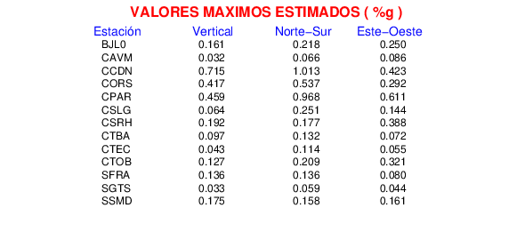 La siguiente tabla muestra los datos de aceleración máxima para cada componente en porcentaje de la aceleración de la gravedad (%g). Estos se obtienen dividiendo el valor del PGA registrado por 980 cm/s2 y multiplicándolo por 100.