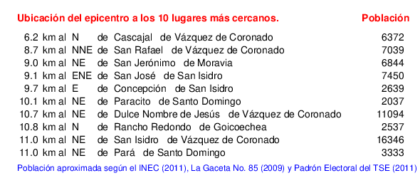Mapa de la zona epicentral. Se muestran las poblaciones más cercanas al epicentro y fallas activas. Abajo están las distancias que hay del epicentro a cada uno de los diez sitios más cercanos y la cantidad de habitantes que poseen.