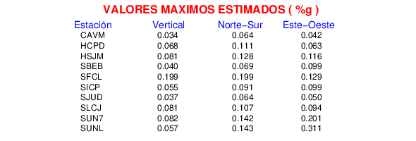 La siguiente tabla muestra los datos de aceleración máxima para cada componente en porcentaje de la aceleración de la gravedad (%g). Estos se obtienen dividiendo el valor del PGA registrado por 980 cm/s2 y multiplicándolo por 100.