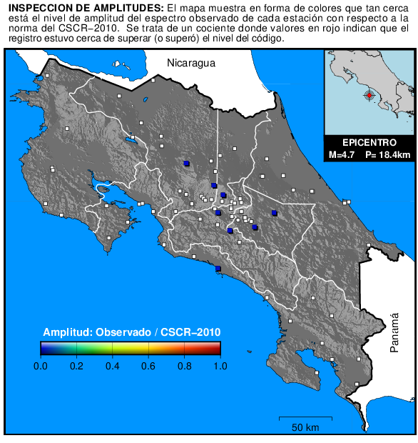 El siguiente mapa muestra de manera resumida qué tan cerca estuvo la amplitud del espectro de respuesta de cada estación de superar el nivel del espectro de diseño del CSCR-2010. El cálculo consiste en comparar periodo a periodo la amplitud del espectro observado con el nivel propuesto por el código en cada sitio para el tipo de suelo y zona sísmica correspondiente.