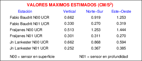 Aquí se muestran las formas de onda y cocientes espectrales de los sensores colocados en pozo . Uno se ubica en el Jardín Lankester en Paraíso de Cartago con 30 m de profundidad y el otro en la Estación Experimental Fabio Baudrit en Alajuela con 40 m de profundidad. La tabla muestra los valores de aceleración máxima (PGA) leídos de las tres componentes en superficie (N00) y en profundidad (N01)