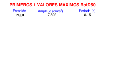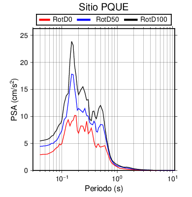 RotD50 representa un valor medio de la respuesta por lo cual se puede comparar con valores de otras medidas empleadas en modelos de atenuación como la Media Geométrica de las componentes ortogonales (GM). RotD0 y RotD100 son los valores extremos (mínimo y máximo), los cuales nos pueden servir para determinar la dispersión de la posible respuesta en cada sitio.