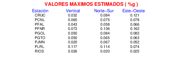 La siguiente tabla muestra los datos de aceleración máxima para cada componente en porcentaje de la aceleración de la gravedad (%g). Estos se obtienen dividiendo el valor del PGA registrado por 980 cm/s2 y multiplicándolo por 100.