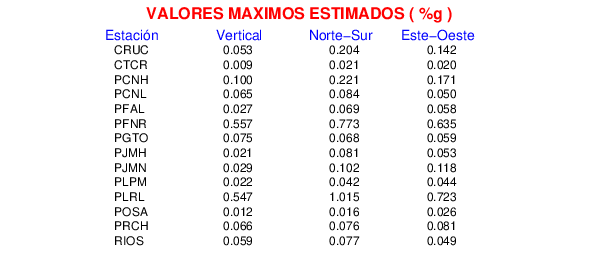 La siguiente tabla muestra los datos de aceleración máxima para cada componente en porcentaje de la aceleración de la gravedad (%g). Estos se obtienen dividiendo el valor del PGA registrado por 980 cm/s2 y multiplicándolo por 100.