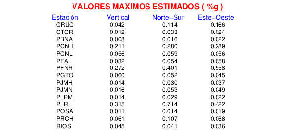 La siguiente tabla muestra los datos de aceleración máxima para cada componente en porcentaje de la aceleración de la gravedad (%g). Estos se obtienen dividiendo el valor del PGA registrado por 980 cm/s2 y multiplicándolo por 100.
