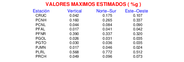 La siguiente tabla muestra los datos de aceleración máxima para cada componente en porcentaje de la aceleración de la gravedad (%g). Estos se obtienen dividiendo el valor del PGA registrado por 980 cm/s2 y multiplicándolo por 100.