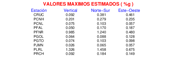 La siguiente tabla muestra los datos de aceleración máxima para cada componente en porcentaje de la aceleración de la gravedad (%g). Estos se obtienen dividiendo el valor del PGA registrado por 980 cm/s2 y multiplicándolo por 100.